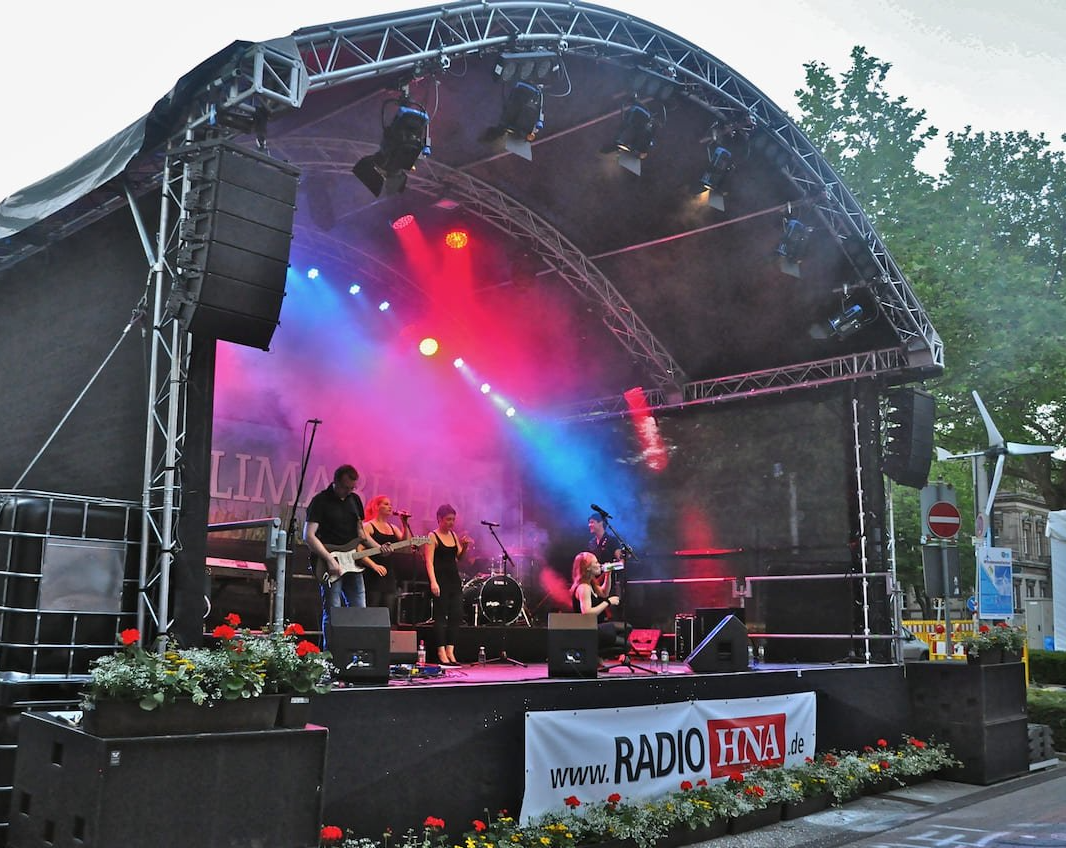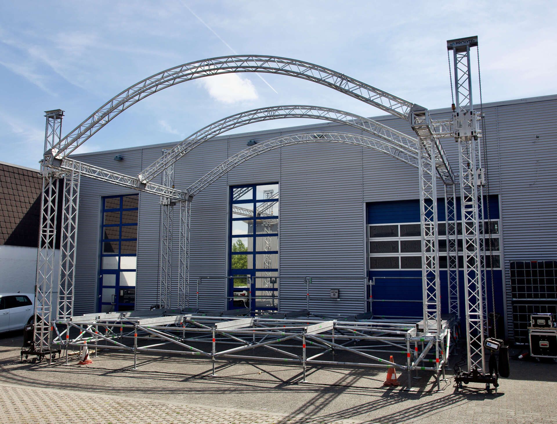 Ob Indoor-Event oder Open Air Bühne, wir sorgen für einen sicheren Untergrund und eine wetterfeste Überdachung. Von der 6m x 4m Prolyte ARC-Stage Rundbogenbühne bis zur Camco CA 8 Bühne mit bis zu 18m Breite. Individuell geplant, natürlich auch mit Baubuch.